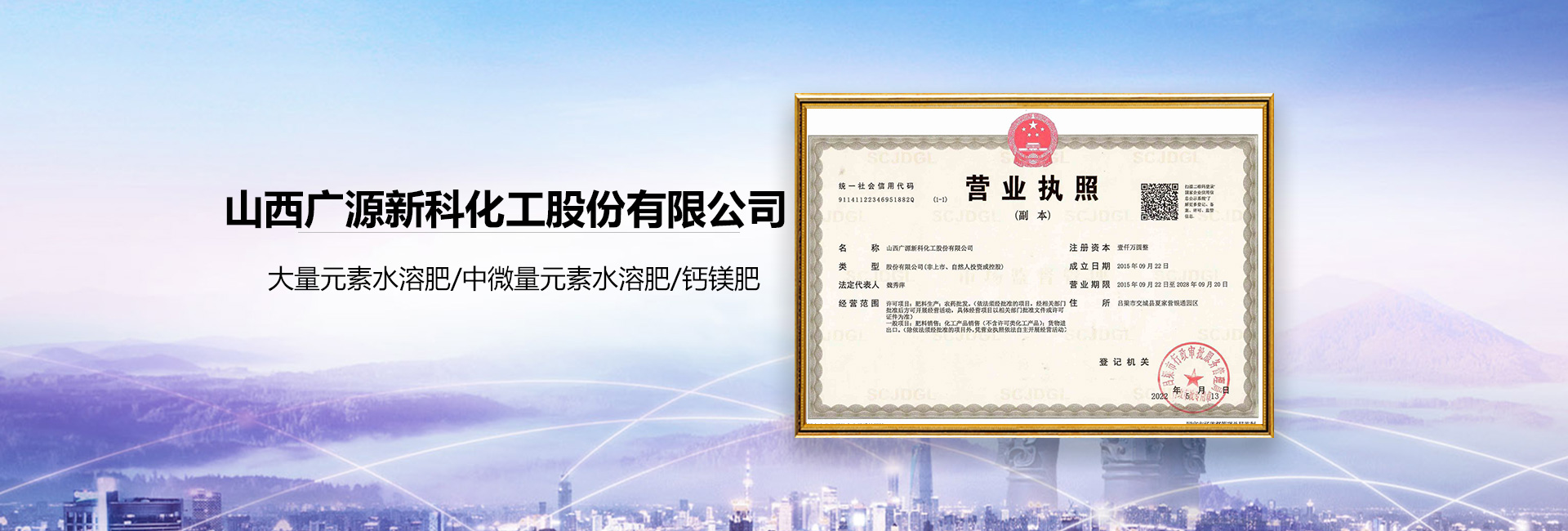 山西廣源新科化工股份有限公司是一家集科研、生產(chǎn)銷(xiāo)售為一體的綜合性現(xiàn)代化企業(yè),公司位于中國(guó)重要的能源煤化工基地﹣﹣山西省交城縣。公司旗下有煤礦、無(wú)煙煤基地、鈣石廠(chǎng)、鋁礬土礦及硝酸廠(chǎng)。優(yōu)勢(shì)產(chǎn)品有:硝酸銨鈣、硝酸鈣鎂、大中微量元素水溶肥、礦源黃腐酸鉀、氨基酸沖施肥、腐植酸水溶肥等。產(chǎn)品銷(xiāo)售覆蓋全國(guó)各地,出口國(guó)外,行銷(xiāo)二十多個(gè)地區(qū)。